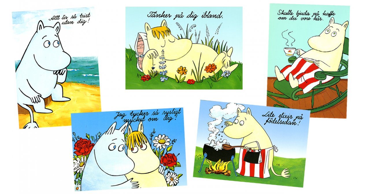 Finnish postcard manufacturer Karto launched the first Moomin postcard set in 1990. Over 25 years ago, Tove Jansson’s brother, Lars Jansson, together with Eija Watia, nowadays Karto’s Product Manager, wrote the texts for the first Moomin postcards. After that, the product designer at Karto handwrote the texts and chose the coloring for the images.