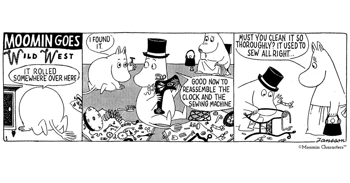 The first Moomin comic strip Tove and Lars made together was #14 Moomin Goes Wild West (1957). Siblings made the text together and Tove drew the illustrations. The difference between the comics made by Tove or Tove and Lars together is only the signature – either Tove Jansson or Jansson (or nothing).