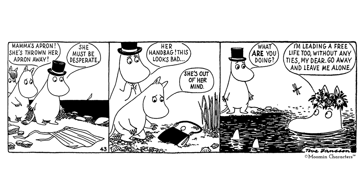 In the first Moomin books, as well as in the first Moomin comic Mumintrollet och jordens undergång the loved Moominmamma is presented without an apron. She can only be recognized because of her black handbag, containing all kinds of important things in an emergency.