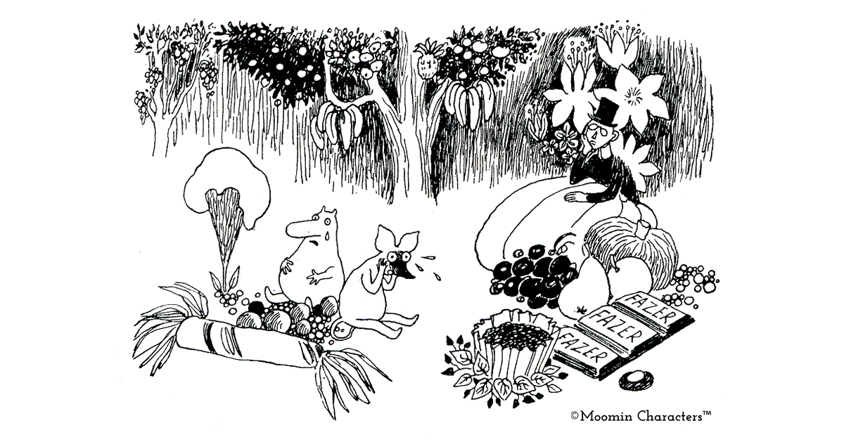 Tove Jansson’s cooperation with the Finnish candy manufacturer Fazer started before the first Moomin book in 1937. Tove started with a decoration for Fazer Munkkiniemi, and after that, the cooperation included drawing advertisements and illustrating packages.