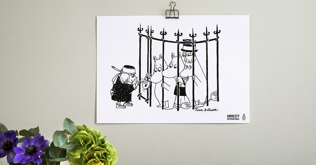 Tove Janssonin muumitarinoiden teemat ovat edelleen hyvin ajankohtaisia ja yhtälailla Amnestyn työ mielipidevankien vapauttamiseksi jatkuu edelleen. Julisteen tilaaminen on hyvä tapa olla tukemassa tätä työtä.