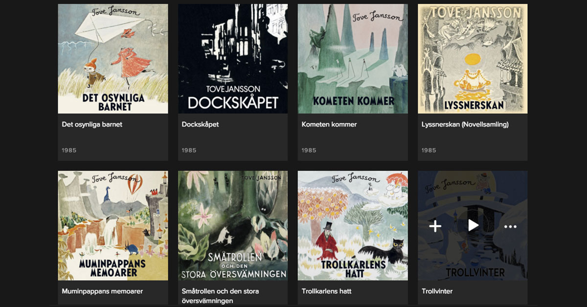 Från och med i dag kan du lyssna på Tove Janssons ljuvliga uppläsningar av Muminböckerna och hennes övriga litteratur. Lyssna i bilen på vägen till jobbet, på sommarstugan på helgen eller med barnen en regnig söndagseftermiddag.